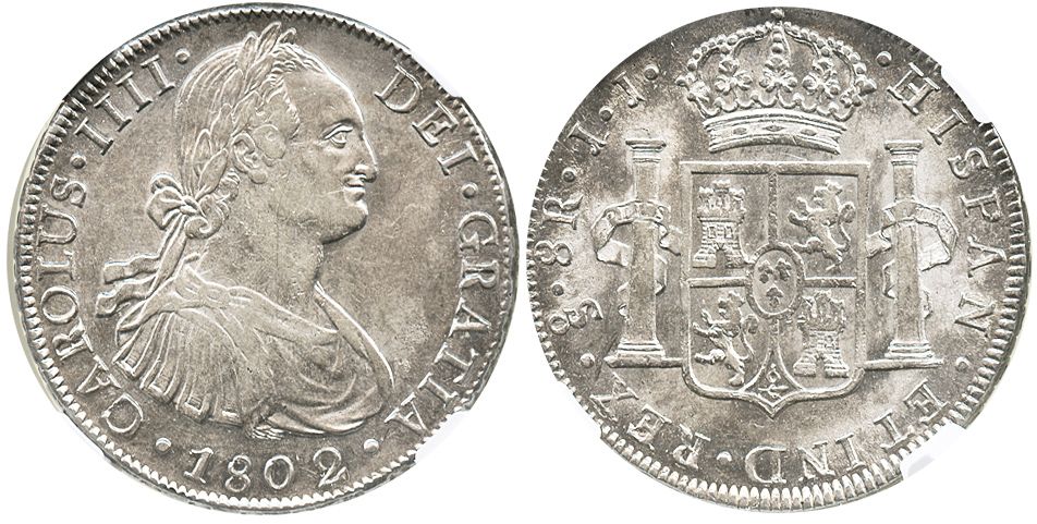 Santiago, Chile, bust 8 reales, 1802JJ, encapsulated NGC AU 58, finest known graded by NGC.