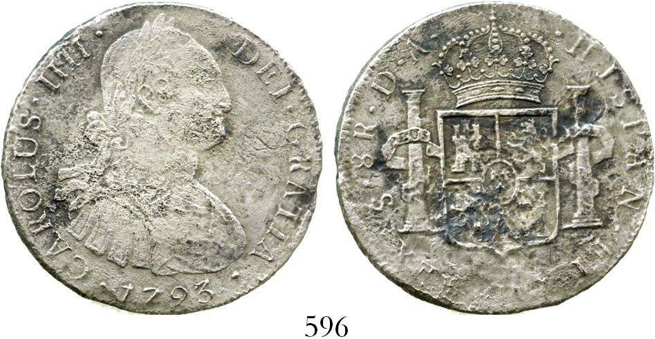 Santiago, Chile, bust 8 reales, Charles IV, 1793DA. KM-51; CT-738. 22.2 grams. Moderately corroded but with clear details, scarce mint. With certificate from the salvager (Stenuit). From the Athenienne, sunk in 1806 off Sicily in the Mediterranean