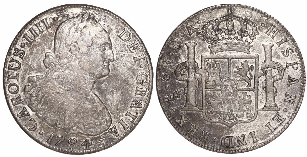 Santiago, Chile, bust 8 reales, Charles IV, 1794DA. 26.66 grams. AXF with scratches and light (patchy) toning, much underlying luster.