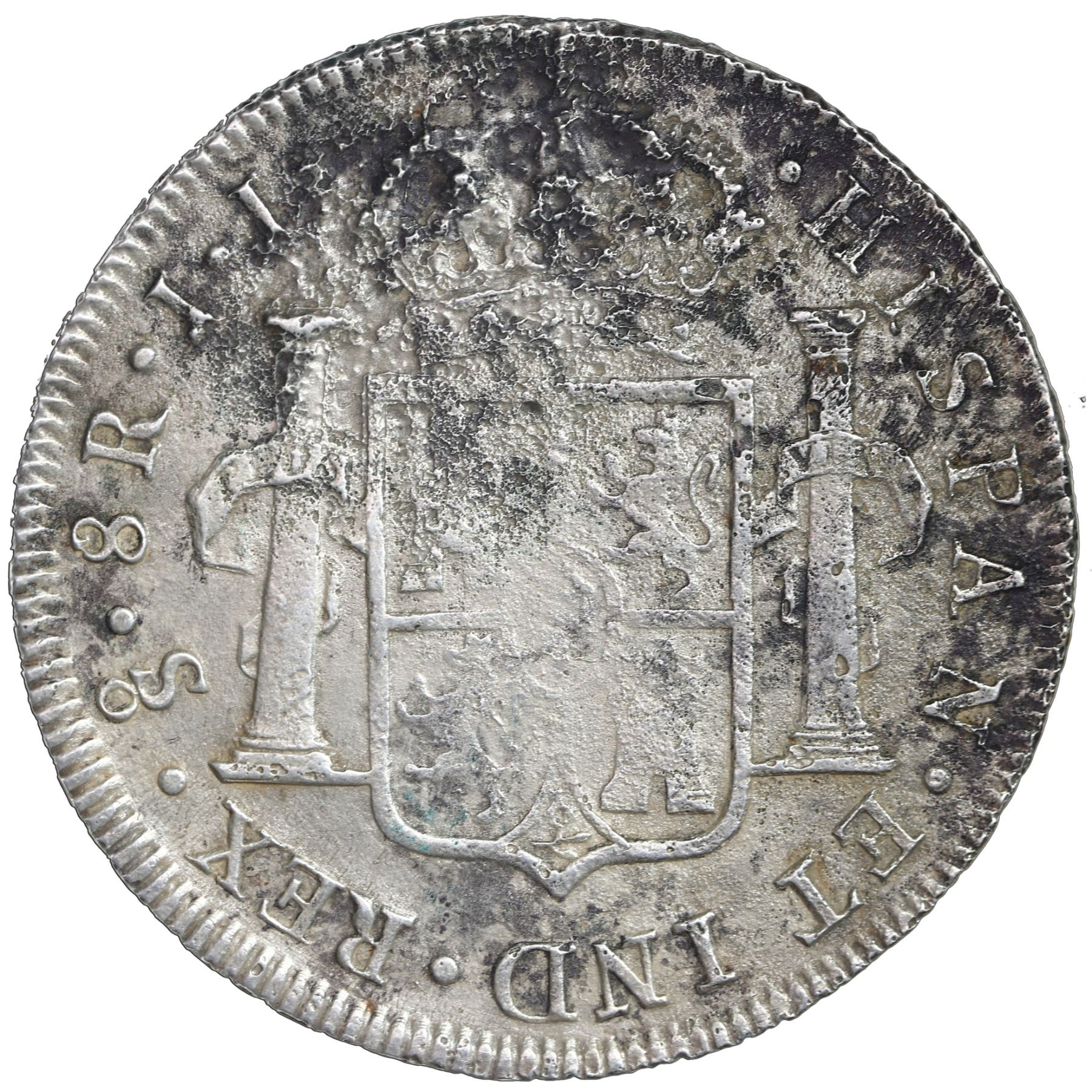 Santiago, Chile, bust 8 reales, Charles IV, 1802 JJ. KM-51; Cal-1037. 25.77 grams. Our first time auctioning a Chilean coin from this scarcely encountered wreck. Minor surface pitting yet fairly high grade (AU or so) with clear details throughout, dark spots around the legends. With Sedwick certificate from 2004. Recovered from: Lady Burgess, sunk in 1806 off the Cape Verde Islands, west of Africa