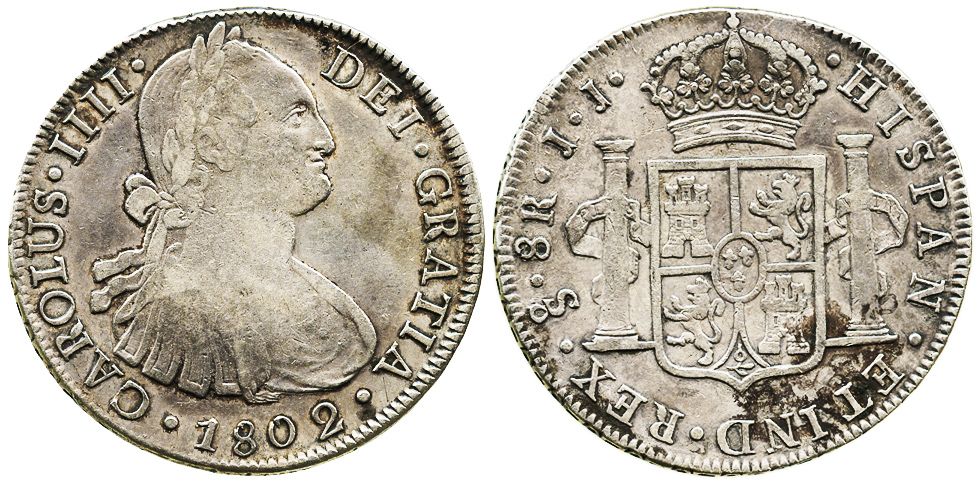 Santiago, Chile, bust 8 reales, Charles IV, 1802JJ. KM-51; CT-752. 26.3 grams. VF with light toning all over, a few dark spots near rims, no problems.
