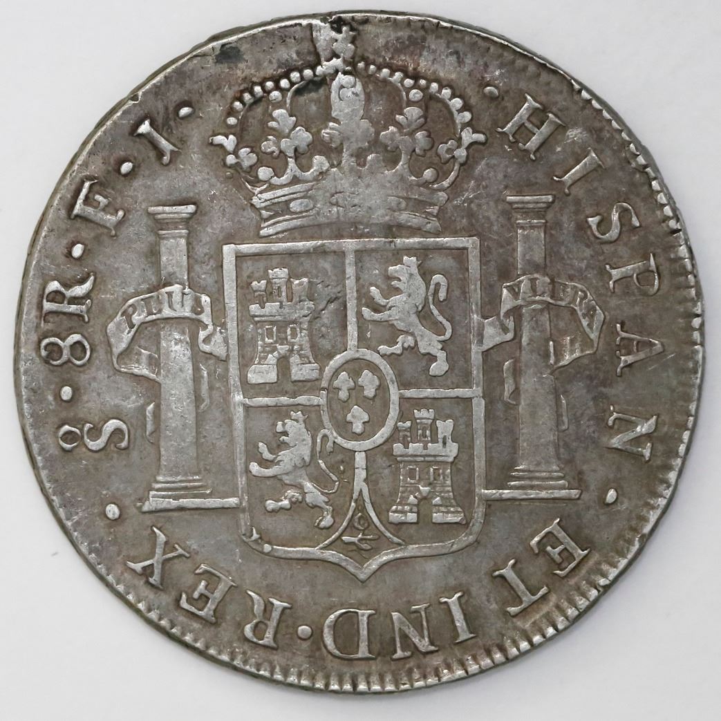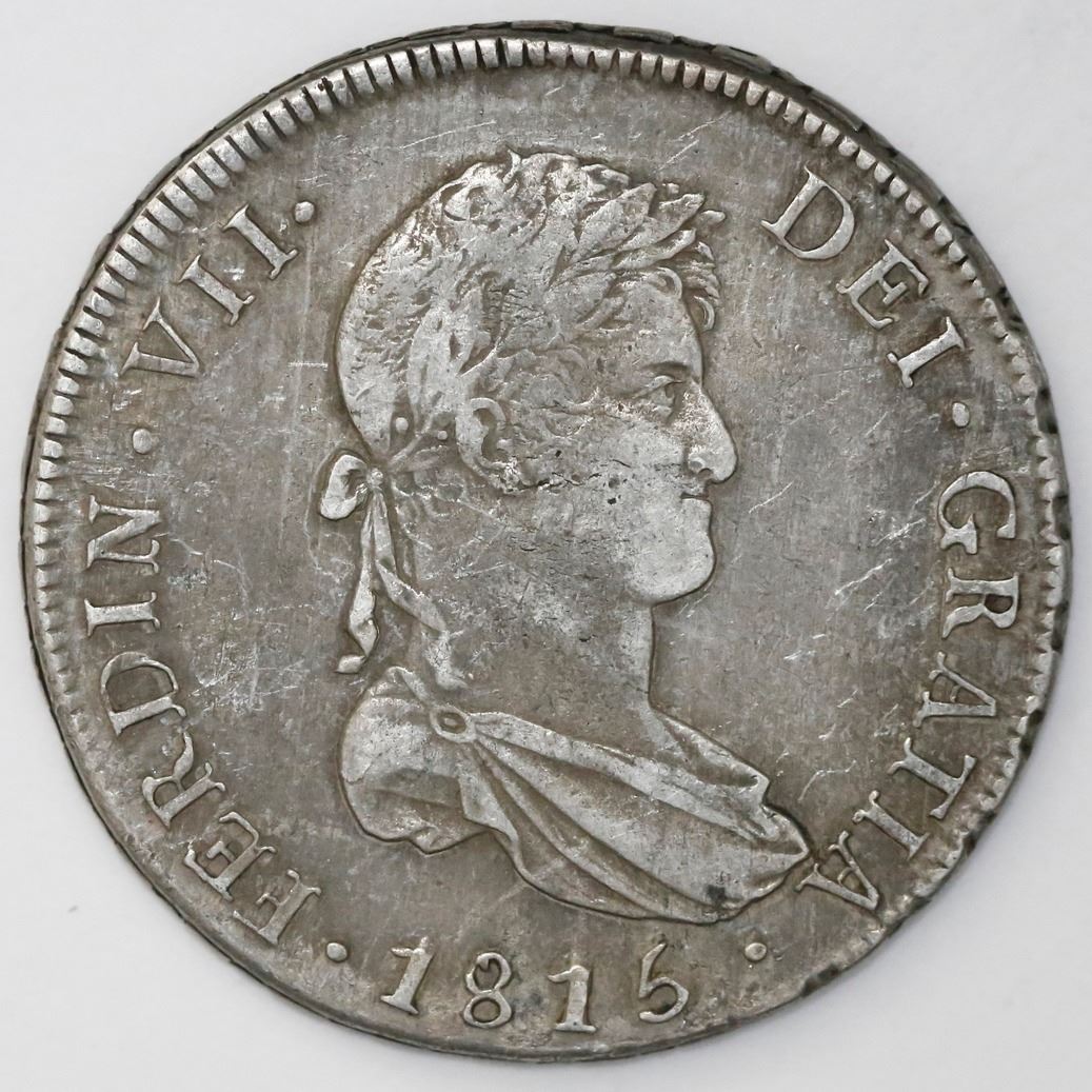 Santiago, Chile, bust 8 reales, Ferdinand VII, 1815FJ. KM-80; CT-631. 27.11 grams. XF with crude rims (as made), light chalky toning throughout.