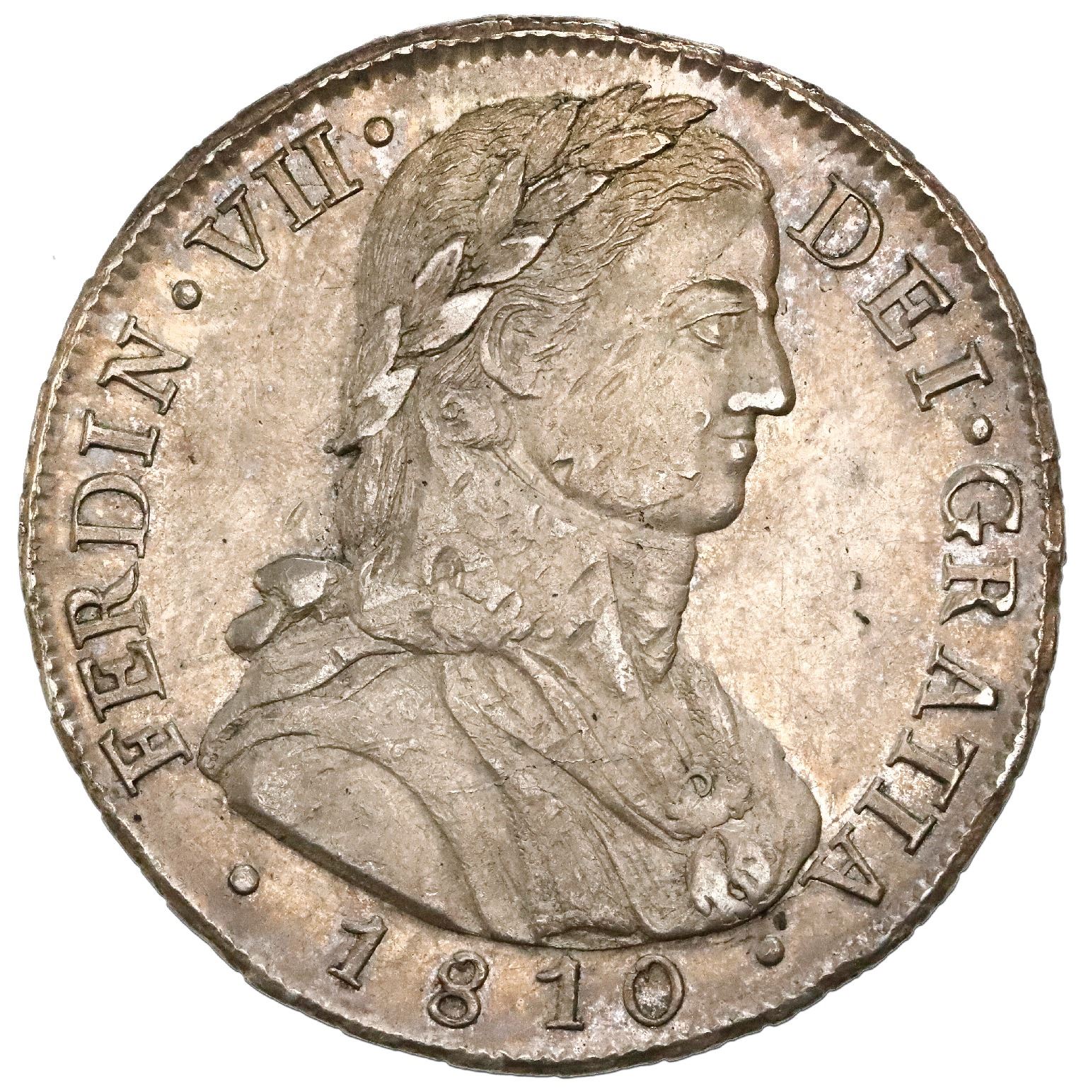 Santiago, Chile, bust 8 reales, Ferdinand VII transitional (laureate "admiral" bust), 1810FJ, NGC MS 61. KM-75; Cal-1403. Choice bold strike with light natural toning over faint luster throughout, with a few small (old) marks on the well-detailed bust and just a touch of high-point wear, scarce and desirable two-year type with laurel wreath in Ferdinand's hair. NGC #5938098-016.