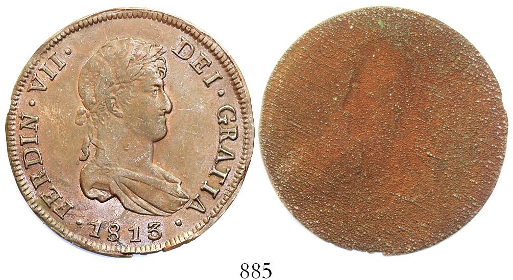 Santiago, Chile, copper obverse uniface trial strike of an 8 reales of Ferdinand VII, 1813. 7.57 grams. Mint State, brown in color but with slight traces of original red color here and there, the backside rusty and rough.