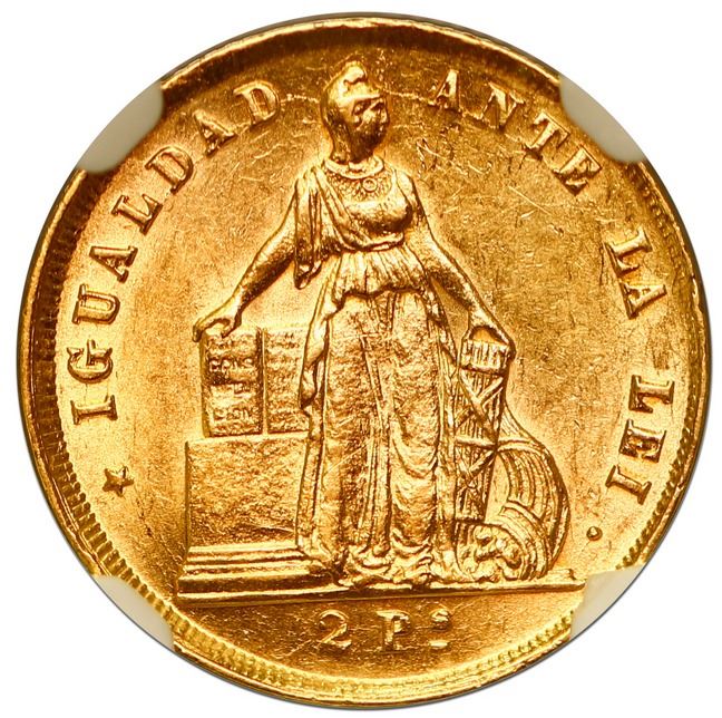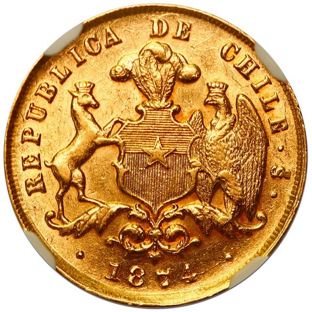 Santiago, Chile, gold 2 pesos, 1874, NGC MS 62, ex-Barros Franco. KM-143. Brightly lustrous in white-yellow gold, bold strike and rims. Pedigreed to the Jose Miguel Barros Franco Collection (stated on label).