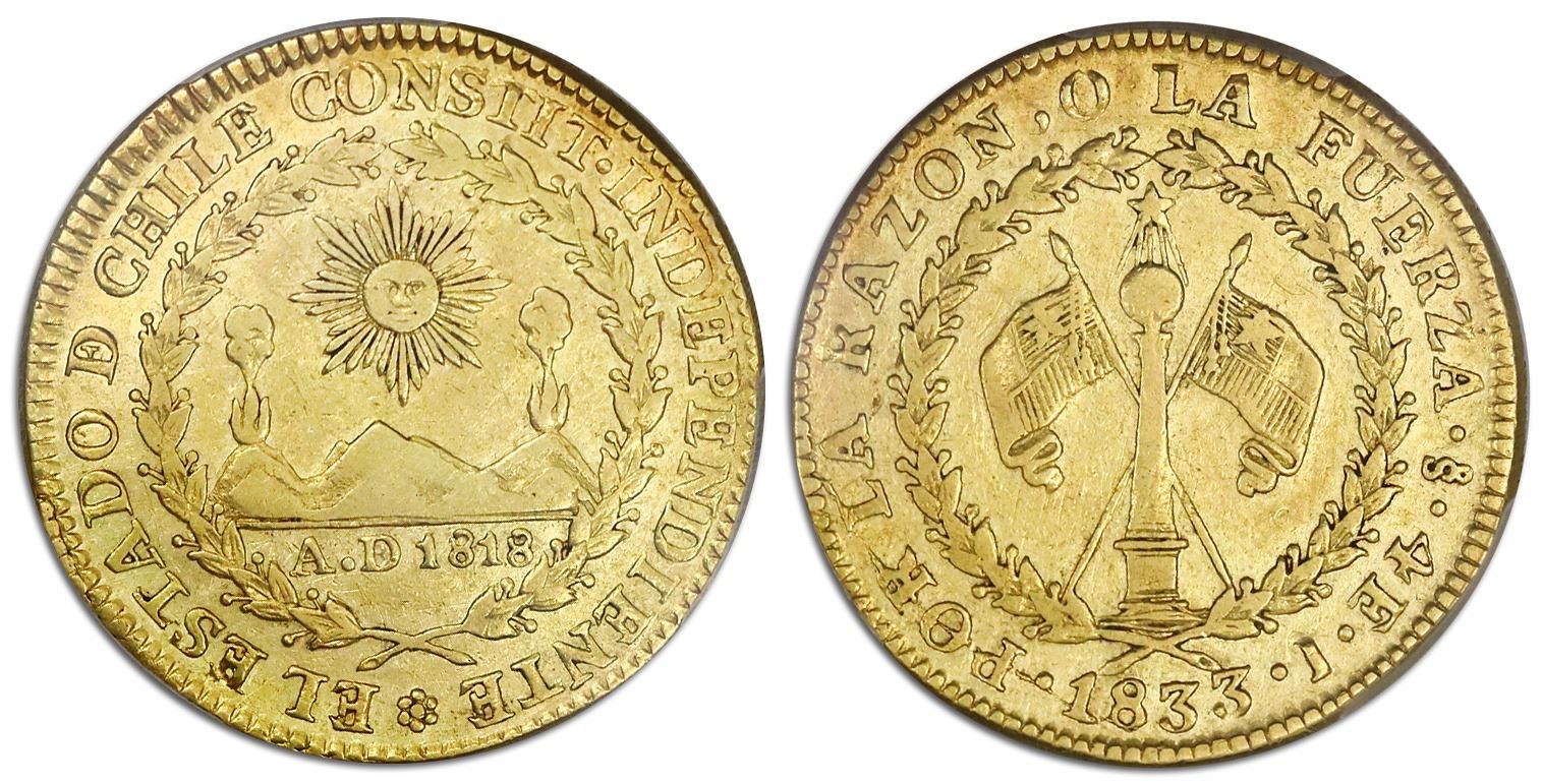 Santiago, Chile, gold 4 escudos, 1833, assayer I, PCGS XF40, finest known in both NGC and PCGS censu