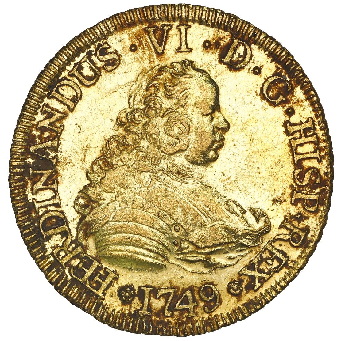 Santiago, Chile, gold bust 4 escudos, Ferdinand VI, 1749 J, NGC MS 61 / La Luz (1752), ex-Sotheby's