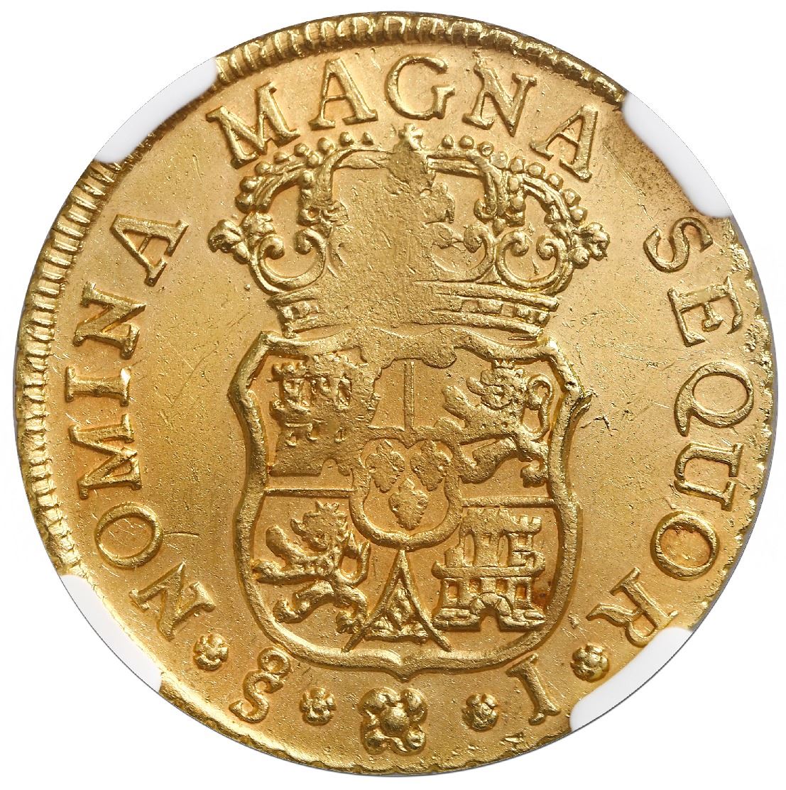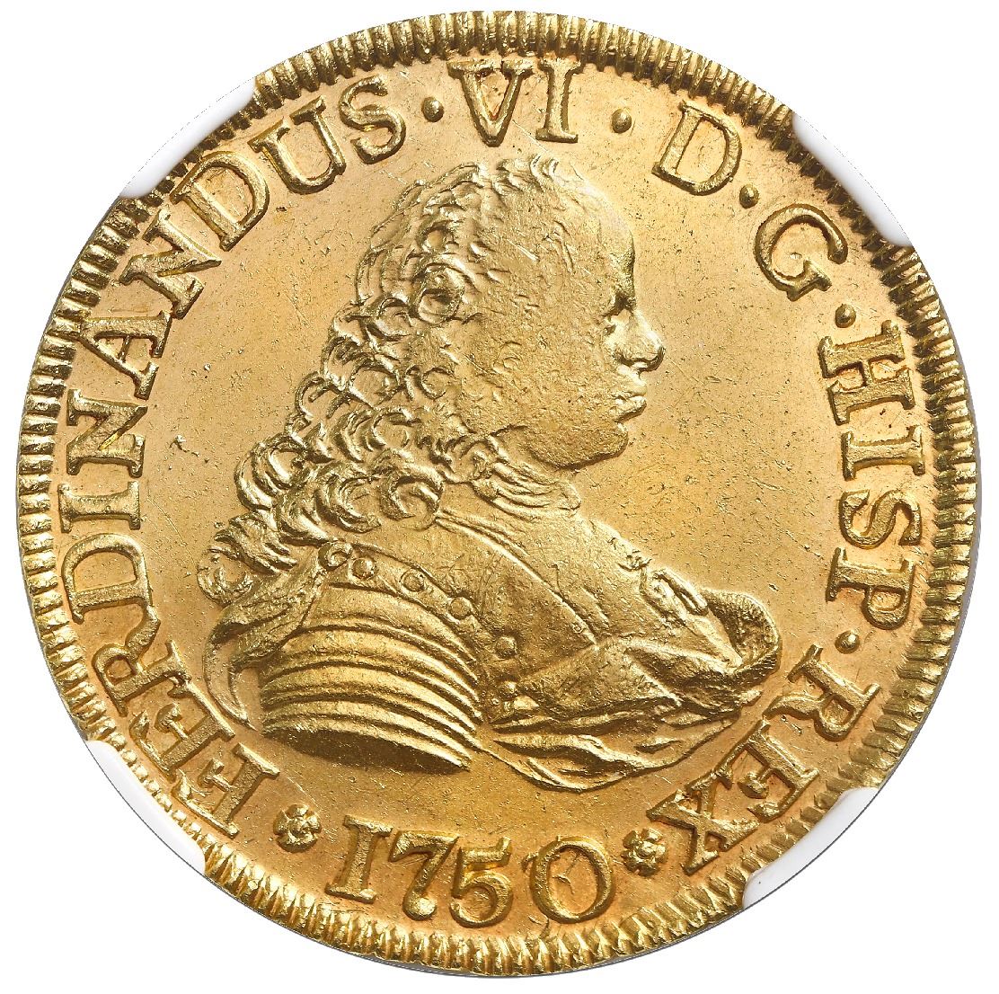 Santiago, Chile, gold bust 4 escudos, Ferdinand VI, 1750/5J, NGC AU 58 / Luz shipwreck. KM-2; Cal-742. Typical shipwreck specimen with slightly matte fields but lustrous legends, weak strike in centers. NGC #19999751-001. From the Luz (1752).
