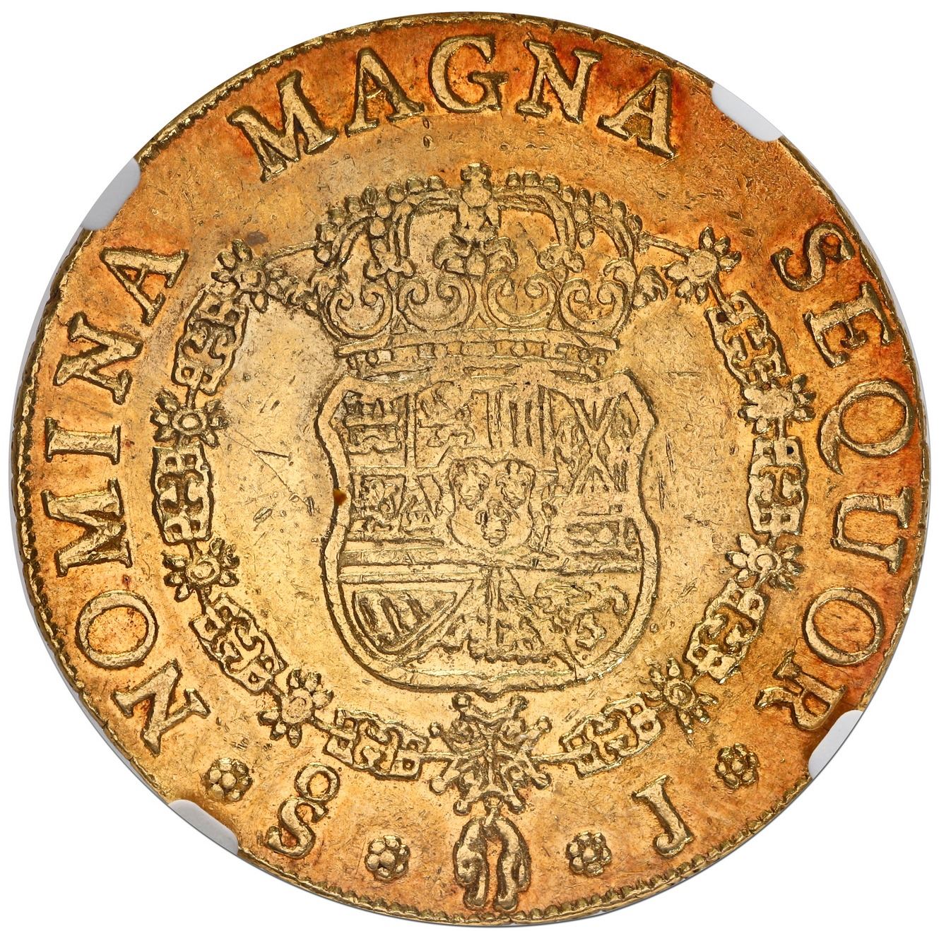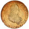 Santiago, Chile, gold bust 8 escudos, Charles III, 1761 J, NGC AU 53. KM-20; Cal-2127. Lovely red toning over luster in legends, well-detailed strike but with lots of tiny bagmarks, scarce type.