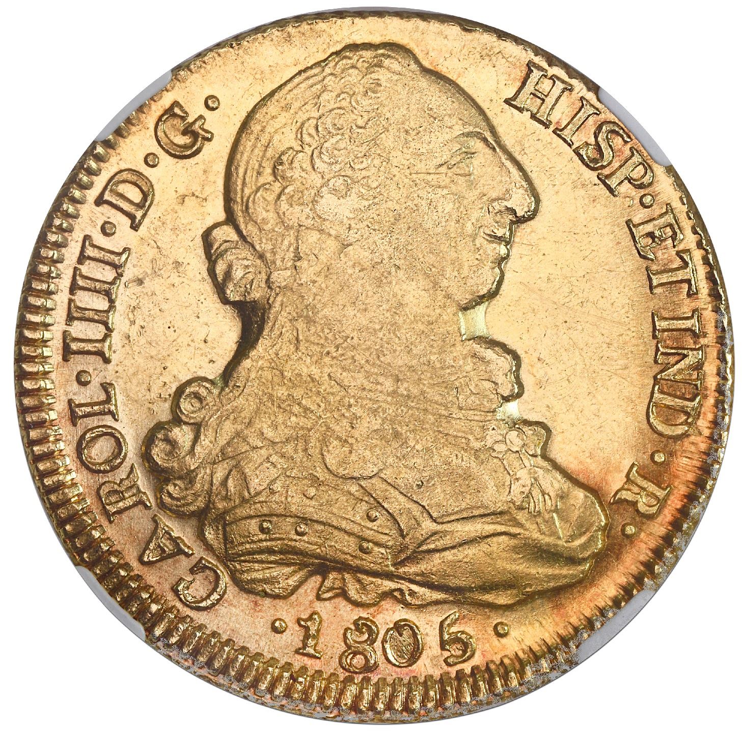 Santiago, Chile, gold bust 8 escudos, Charles IV (bust of Charles III), 1805FJ, NGC MS 62, finest known in NGC census. KM-54; Cal-1775. Choice luster and fairly strong details, starting to tone in legends, slightly off-center obverse and small lamination flaw on reverse. NGC #4916868-003.