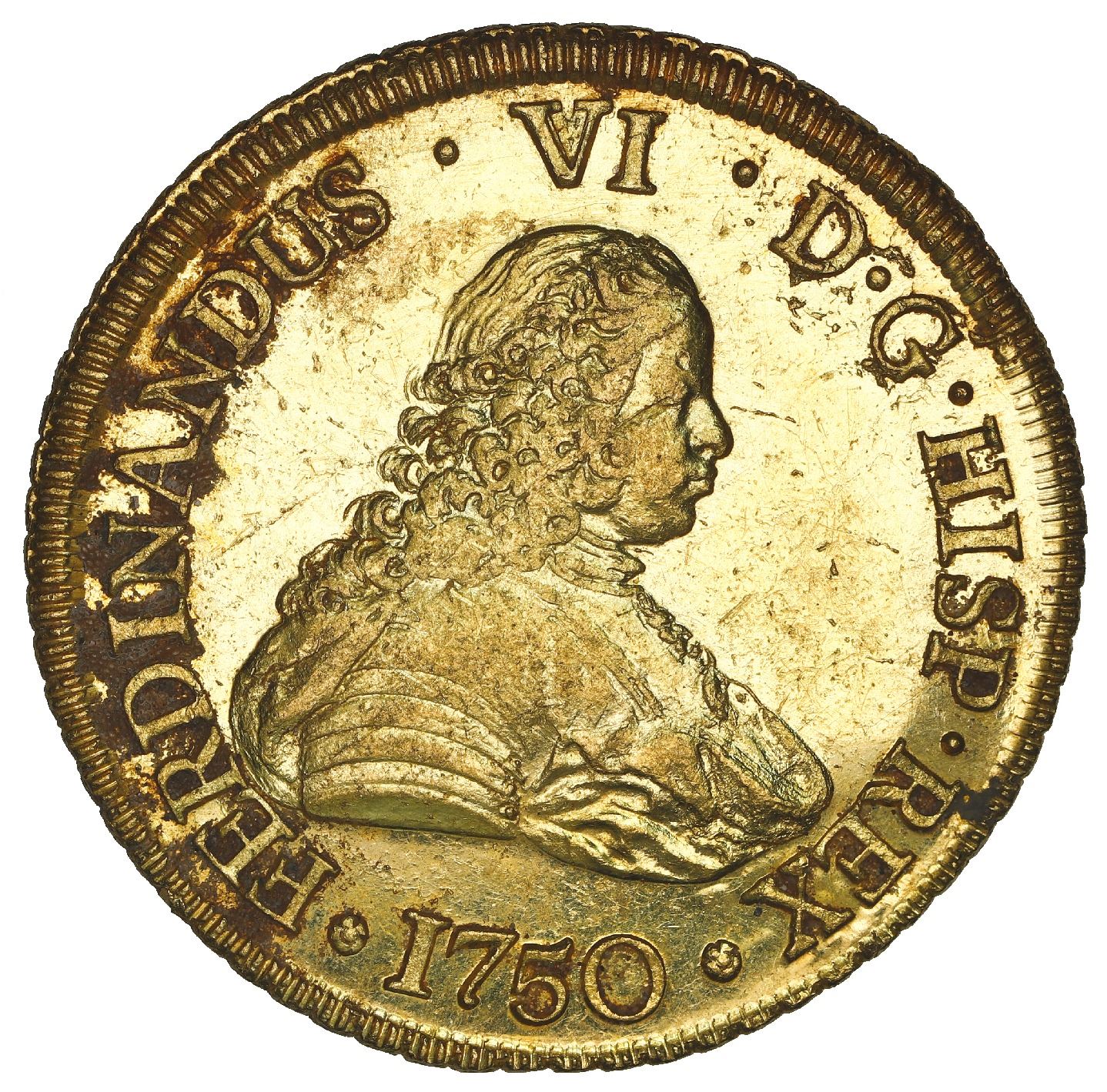 Santiago, Chile, gold bust 8 escudos, Ferdinand VI, 1750 J, NGC MS 61 / La Luz (1752), ex-Sotheby's