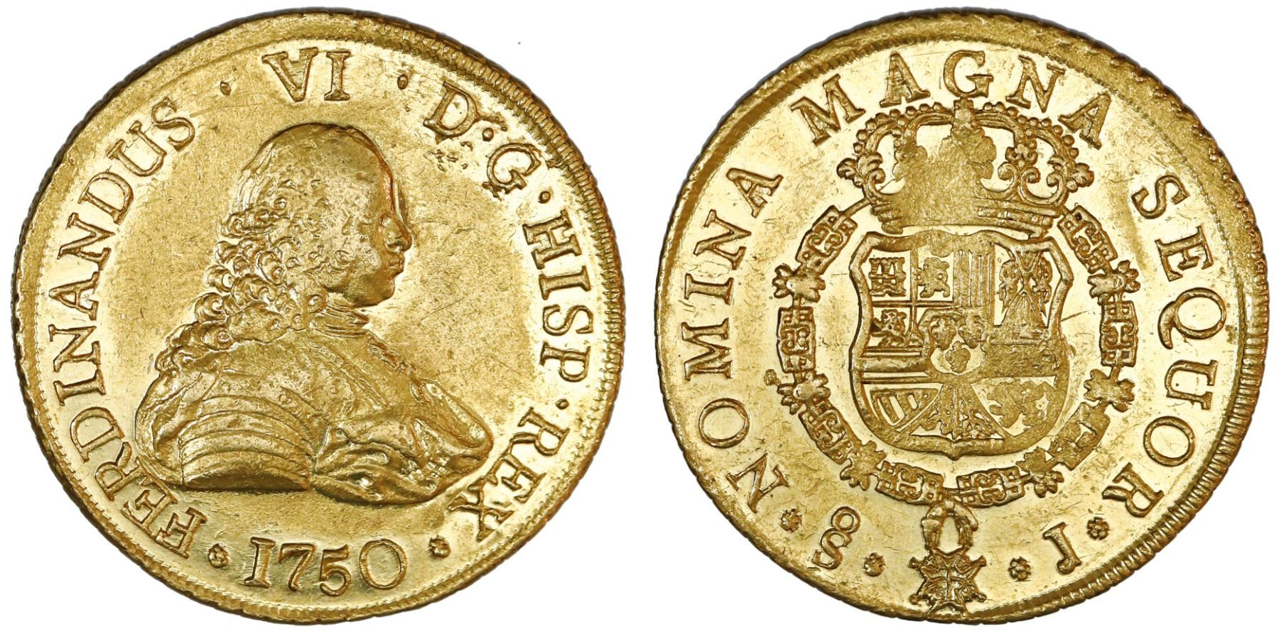 Santiago, Chile, gold bust 8 escudos, Ferdinand VI, 1750J, NGC AU 55 / La Luz. KM-3; Cal-822. Brightly lustrous (especially the reverse) with some muting in fields but prooflike in legends, typically weak strike in centers and on rims (befitting of the first 8E struck at this mint) but still fully detailed, begging for a higher grade, far scarcer than 1751 in any case. NGC #4769919-001. Recovered from: Luz, sunk in 1752 off Montevideo, Uruguay