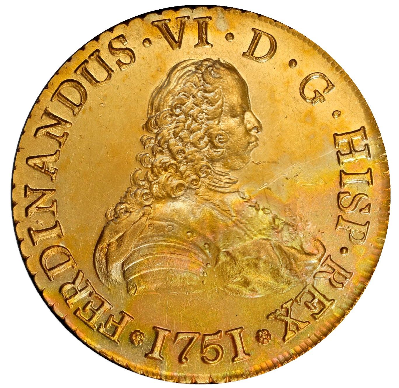 Santiago, Chile, gold bust 8 escudos, Ferdinand VI, 1751 J, PCGS AU58 / La Luz. Cal-824; KM-3: Fr-5. Choice full strike (no central weakness) and lustrous fields, with lovely streak of rainbow toning on bottom half of obverse, a few light scratches in front of face that must be why this coin was not given a full MS grade. With photo-certificate, pedigreed to the Val y Mexia Collection (stated on label). Recovered from: Luz, sunk in 1752 off Montevideo, Uruguay Please use this link to verify the certification number