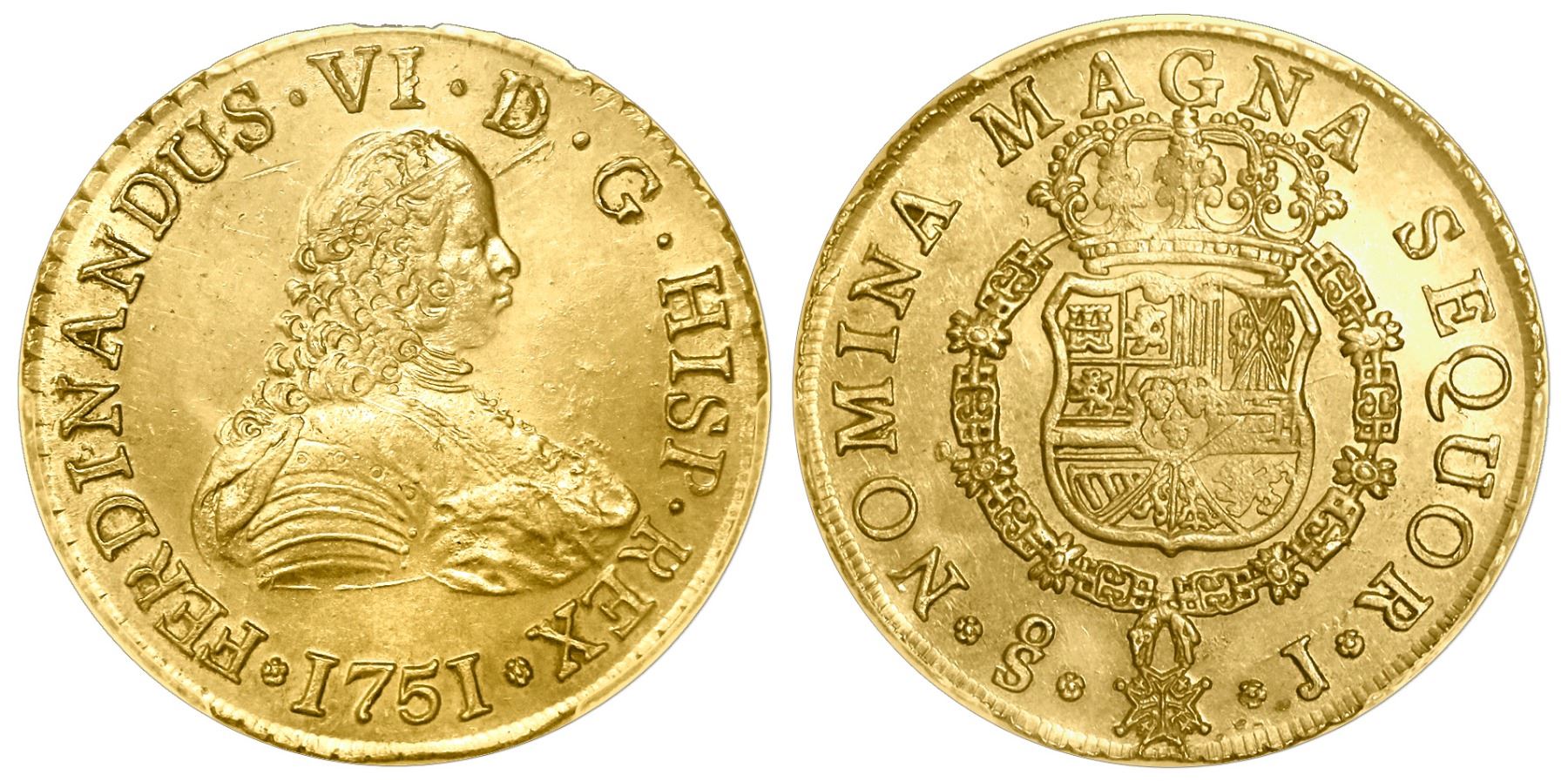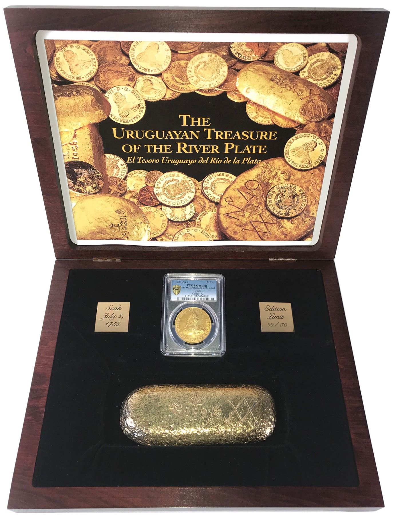 Santiago, Chile, gold bust 8 escudos, Ferdinand VI, 1751J, PCGS UNC detail / salt water damage, in promotional box with replica ingot. CT-72; KM-3. 11/12" x 9-1/2" x -1-3/4" (box). Well struck and lustrous underneath a panoply of subtle rainbow colors, a few minor scratches, attractive promotional set with cast replica (in silver) of one of the gold ingots recovered from this wreck. Housed in large wooden promotional box with certificates and gold-plated silver replica of a gold ingot (21 oz), including intact outer carton. PCGS #36269961. Recovered from: Luz, sunk in 1752 off Montevideo, Uruguay