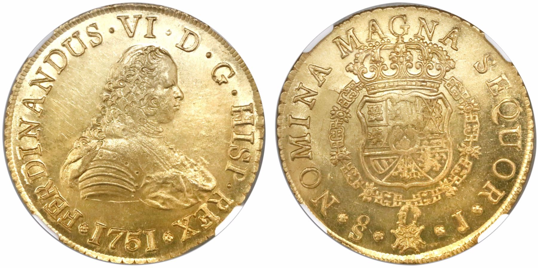 Santiago, Chile, gold bust 8 escudos, Ferdinand VI, 1751J, encapsulated NGC MS 63 / La Luz.