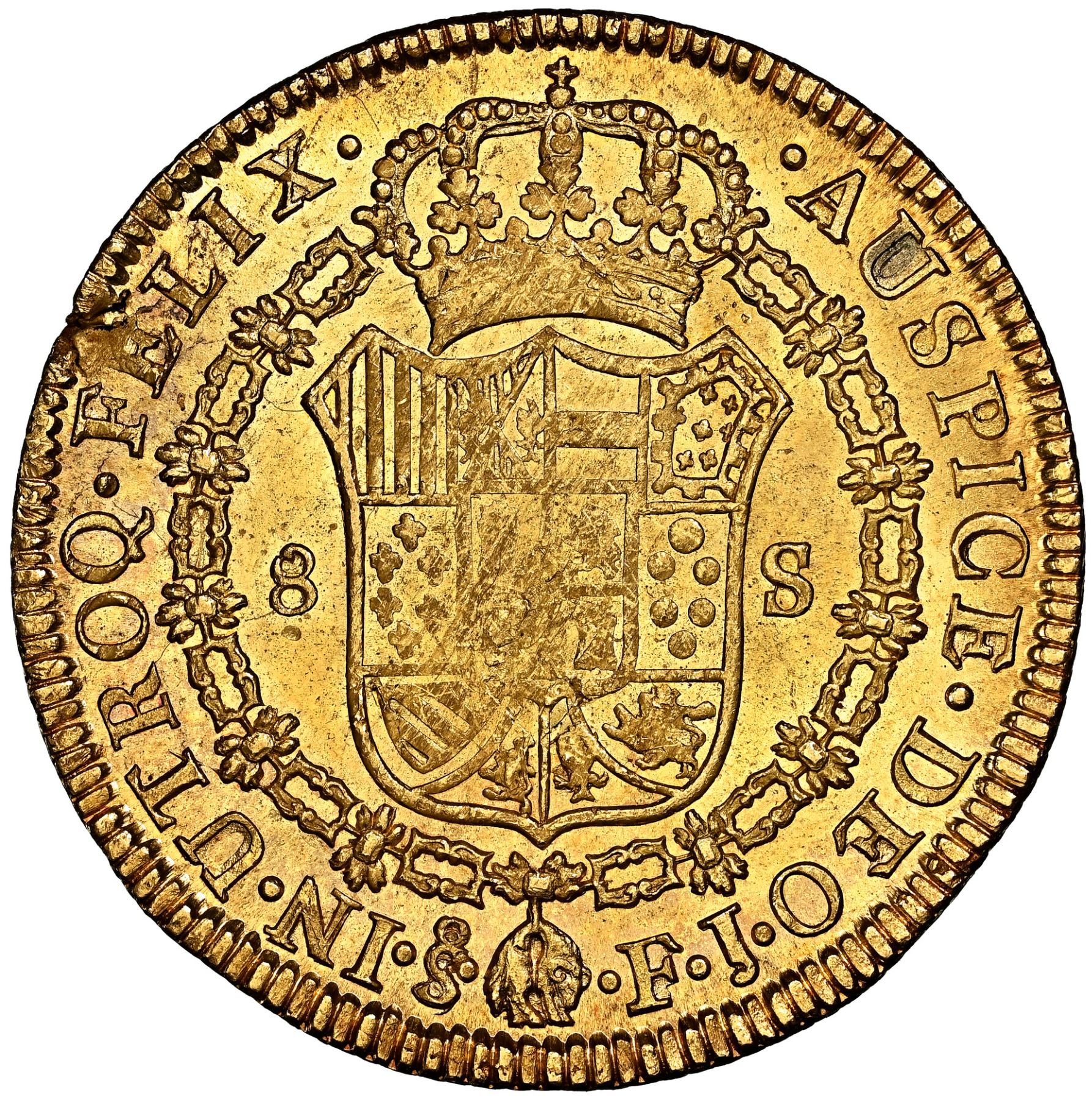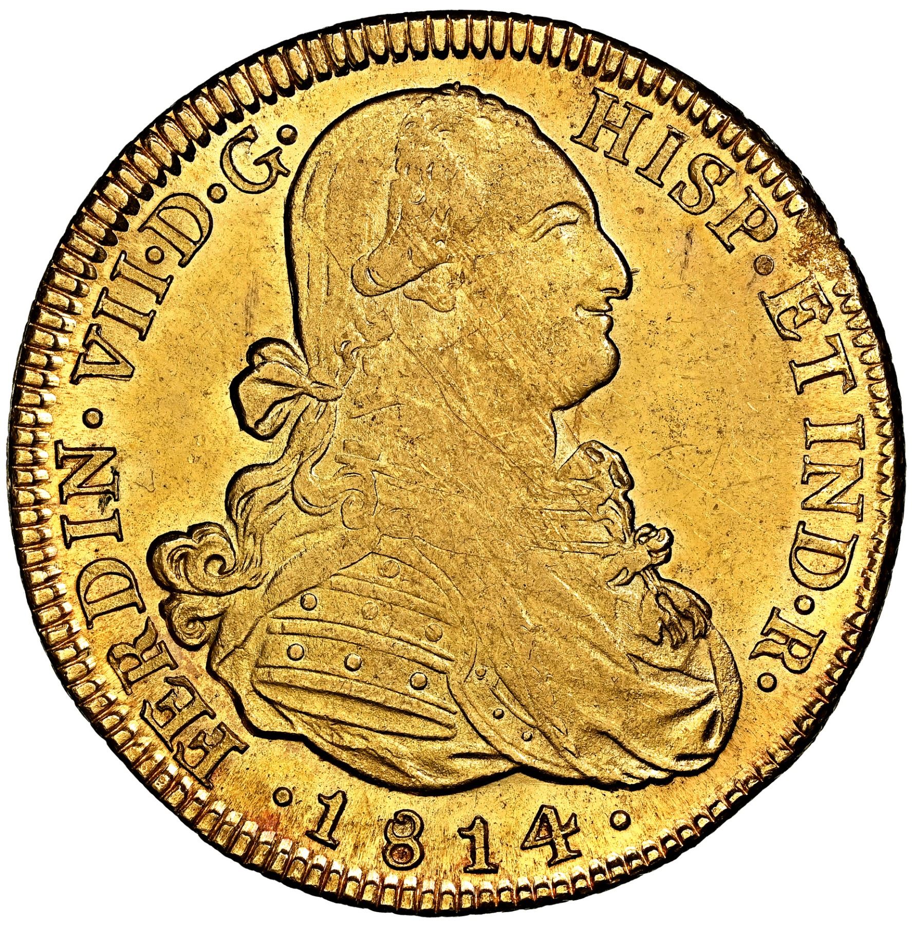 Santiago, Chile, gold bust 8 escudos, Ferdinand VII (bust of Charles IV), 1814 FJ, NGC MS 64+, fines