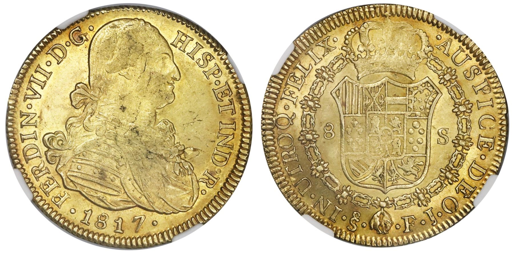 Santiago, Chile, gold bust 8 escudos, Ferdinand VII (bust of Charles IV), 1817FJ, NGC MS 61.