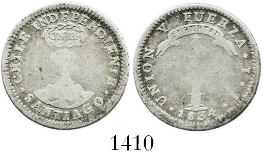 Santiago, Chile, "volcano" 1 real, 1834IJ, medal alignment. KM-91. 3.2 grams. Nice AVF with very weak centers, toned at rims.