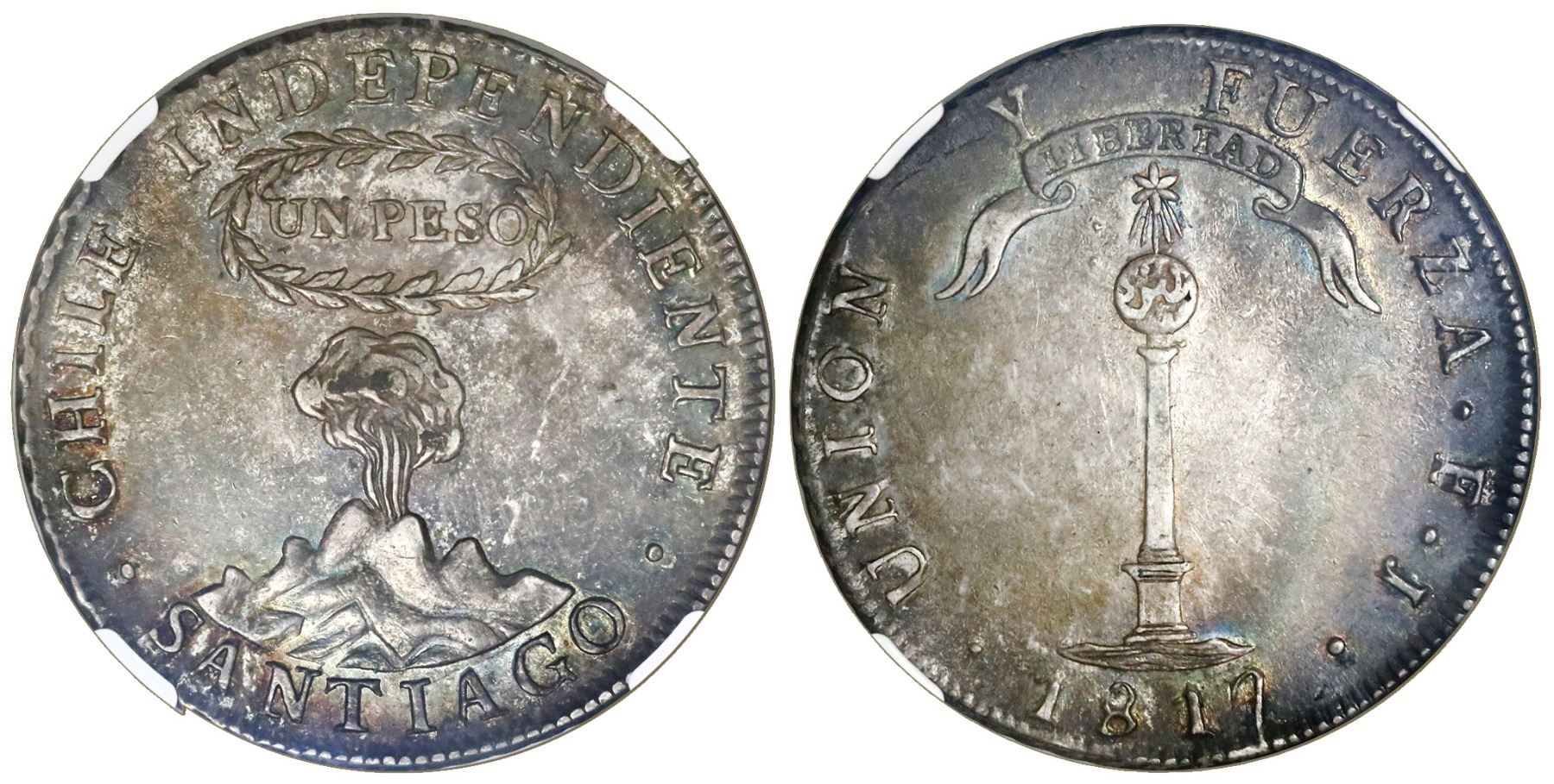 Santiago, Chile, "volcano" peso, 1817FJ, Y to left, NGC AU 53. KM-82.2. Choice strike and rich rainbow toning (quite pretty), also with underlying luster on volcano side, a contender for a higher grade, to be sure. NGC #4460456-008.