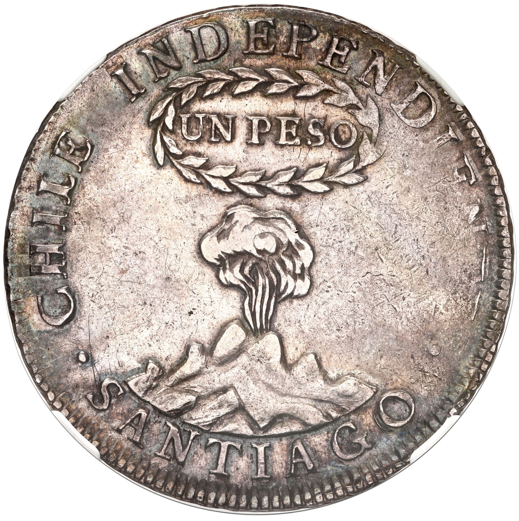 Santiago, Chile, "volcano" peso, 1819 FD, NGC XF details / cleaned. KM-82.2. Richly toned over faintly hairlined surfaces, the iconic volcano full and well detailed but parts of the legends weak.