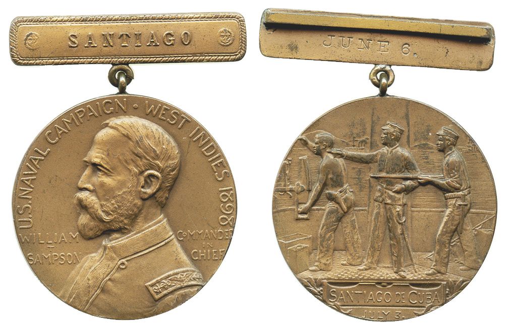 Santiago, Cuba, bronze medal with bar at top, 1898, U.S. Naval Campaign West Indies (Spanish American War), Commander in Chief Sampson, with SANTIAGO on bar at top. 39mm; 34.1 grams. Bust of William E. Sampson on obverse, naval soldiers on reverse, SANTIAGO DE CUBA / JULY 3 in exergue; XF+, light bronze color with touch of toning.