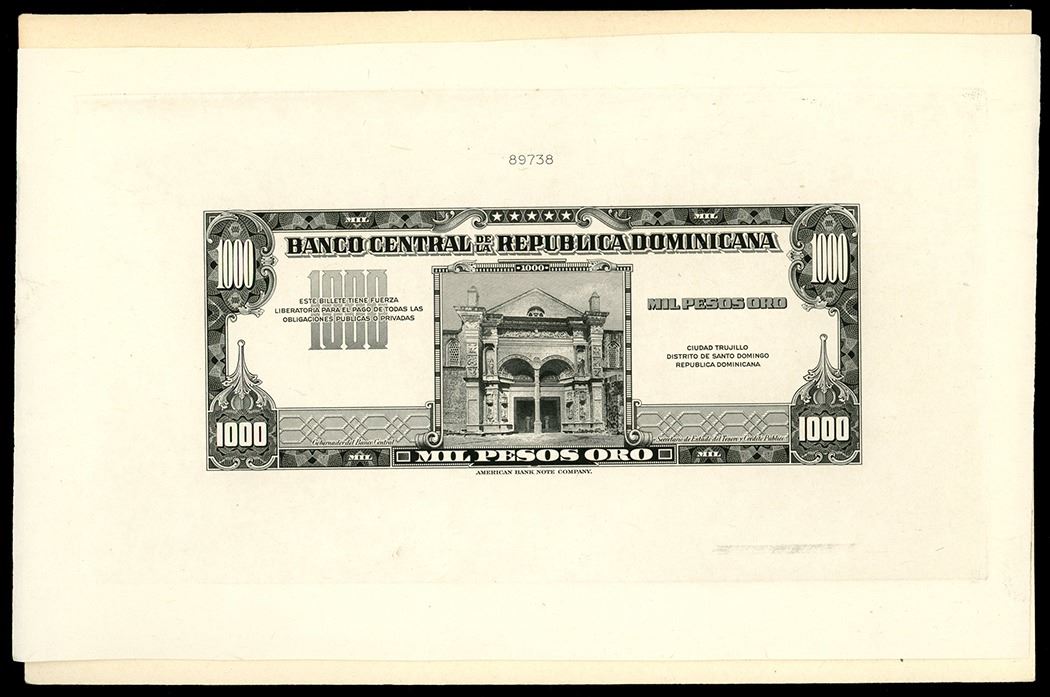 Santo Domingo, Dominican Republic, Banco Central, 1000 pesos oro front and back proofs, ND (1947-54) Pick-67p. Choice UNC pairing of this highest denomination issued by the Banco Central, both mounted on cardstock.