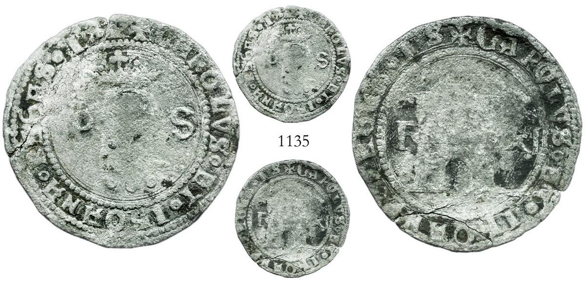 Santo Domingo, Dominican Republic, billon (silver/copper) 11 maravedis, Charles-Joanna, assayer F, extremely rare. 2.8 grams. Very crudely made, but only 5 others known, and this one nearly unique with complete silver surfaces, in fact the first specimen ever offered at auction. Full legends highlighted by contrasting toning, the centers somewhat flat but with clear mintmark P-S on obverse and assayer F to left and denomination XI to right on reverse (an unpublished variety), the planchet thin and round, with part of edge bent, some surface pitting from salvage, really too difficult to grade accurately but clearly better than the photographed example in Estrella (1979).