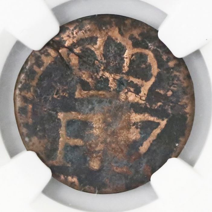 Santo Domingo, Dominican Republic, copper 1/4 real (cuarto), Ferdinand VII, struck ca. 1810-20, NGC Genuine, ex-Rudman. KM-2; CT-1671. Crude About Fine with complete mintmark and nearly full but off-center 1/4 denomination, clear crown with weak yet visible monogram, some surface porosity and verdigris with cleaning on high points. NGC #4503120-014. Pedigreed to the Isaac Rudman collection.