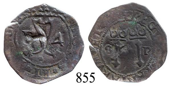 Santo Domingo, Dominican Republic, copper 4 maravedís, Charles-Joanna, assayer F to left, denomination 4 to right, with full anchor countermark (1/7 real, Jamaica, 1611-16). S-SD1. 2.9 grams. Choice specimen with full central detail and much legend, full countermark on reverse, dark-brown VF for issue.