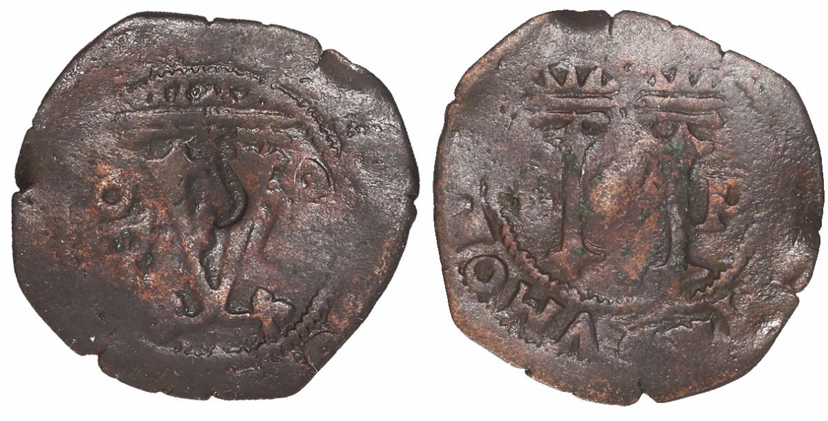 Santo Domingo, Dominican Republic, copper 4 maravedís, Charles-Joanna, assayer oF, with "S" countermark indicating importation to Jamaica (Santiago, 1581-2), very rare. 2.80 grams. Darkly toned Fine with clear pillars and crowned Y, the latter with full oF to left and full S countermark of the long, thin variety, which links to a scheme whereby the governor imported coins from Santo Domingo and made a huge profit in the exchange rate from his cost of 1/25 real to a circulating value of 1/11 real per coin! With small "First Coins of the Caribbean" certificate, and pedigreed to our Auction #11, with original lot-tag #873.