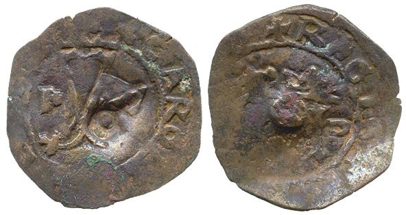 Santo Domingo, Dominican Republic, copper 4 maravedis, Charles-Joanna, assayer F, with anchor countermark indicating importation to and use in Jamaica (1611-16). S-SD1; CT-Type 134. 1.7 grams. Thin host but with much detail (assayer, king's name, P of mintmark), the "ring" of the countermark so deeply impressed that the flan is warped, overall a reddish Fine with some green spots. With small Sedwick certificate from 2002.