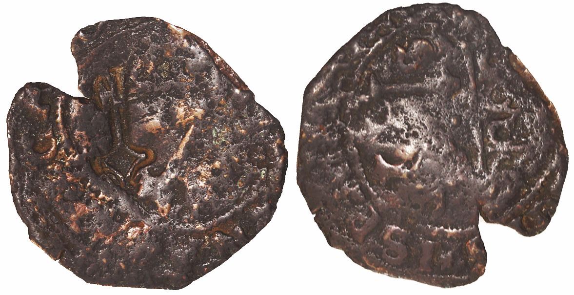 Santo Domingo, Dominican Republic, copper 4 maravedis, Charles-Joanna, assayer F, with key countermark indicating revaluation to 2 maravedis in 1577. 1.96 grams. Thin and corroded host coin (About Fine at best) but with full and bold countermark, which is scarce, darkly toned all over. Pedigreed to our Auction #12, with original lot-tag #1180.