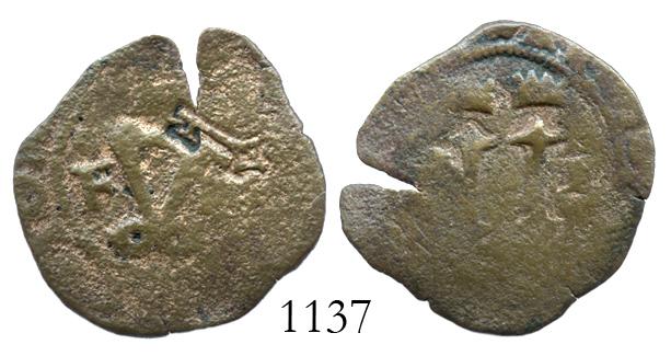 Santo Domingo, Dominican Republic, copper 4 maravedis, Charles-Joanna, assayer F, with key countermark (Santo Domingo, 1577, revaluation to 2 maravedis), scarce. 2.8 grams. Full key countermark at upper right and bold assayer F to left, most of crowned pillars on other side, somewhat red but corroded, with edge-split. Pedigreed to our Treasure Auction #4 of November 6, 2008 (lot 777), with original tag.