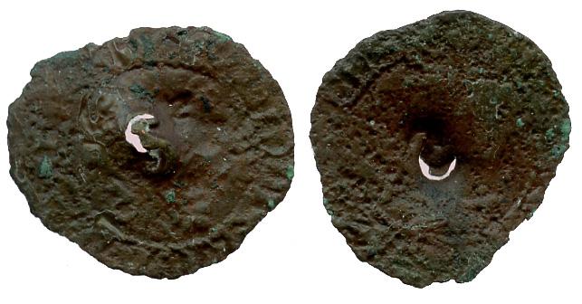 Santo Domingo, Dominican Republic, copper 4 maravedis, Charles-Joanna, assayer not visible (F), with backwards "S" countermark of Jamaica (1581-2). S-SD1. 1.6 grams.Corroded and featureless except for the deeply impressed countermark that breaches the other side, the S referring to the first Spanish city of Santiago on the island of Jamaica. (Note: It is possible the host coin was actually struck in Spain instead.)