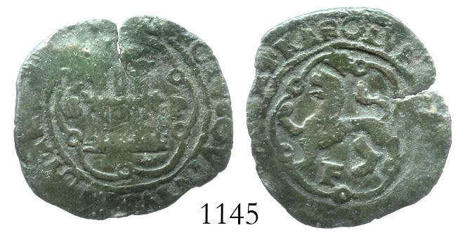 Santo Domingo, Dominican Republic, copper 4 maravedis, Charles V, assayer F, scarce. 3.3 grams. Far less common than the earlier series of copper coins, with S-castle-P (instead of monogram and assayer and denomination) on obverse and lion above assayer (instead of pillars and mintmark) on reverse, both prominent on this coin, KAROLVS OINTVS (Quintvs) in legend (as struck after Joanna's death in 1555), dark-brown Fine with edge-split.