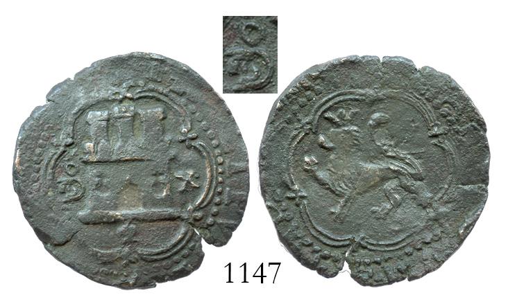 Santo Domingo, Dominican Republic, copper 4 maravedis, Philip II, assayer X, extremely rare. 8.2 grams. From a very small, recently found Caribbean cache of these coins (dispelling the theory that they were struck in Spain), finally allowing us to study the different die-varieties, of which we can identify at least five so far (all of which show a castle above small pomegranate between oSD-monogram mintmark to left and assayer X to right inside a double-line tressure on the obverse and crowned lion on reverse). This specimen shows a castle with even-height turrets, windows as cross-topped orbs, tressure dimples at 2-4-6-8-10-12 o'clock, solid specimen with bold full castle and full lion, brown-toned AVF, small split in edge.