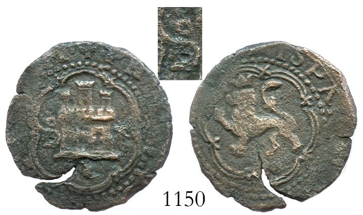 Santo Domingo, Dominican Republic, copper 4 maravedis, Philip II, assayer X, extremely rare. 6.3 grams. From a very small, recently found Caribbean cache of these coins (dispelling the theory that they were struck in Spain), finally allowing us to study the different die-varieties, of which we can identify at least five so far (all of which show a castle above small pomegranate between oSD-monogram mintmark to left and assayer X to right inside a double-line tressure on the obverse and crowned lion on reverse). This specimen shows a castle with relatively taller center turret, windows as cross-topped orbs, tressure dimples at 1-3-5-7-9-11 o'clock, VF details but thin from light corrosion and with large edge-split, nice copper color, bold full castle and lion.