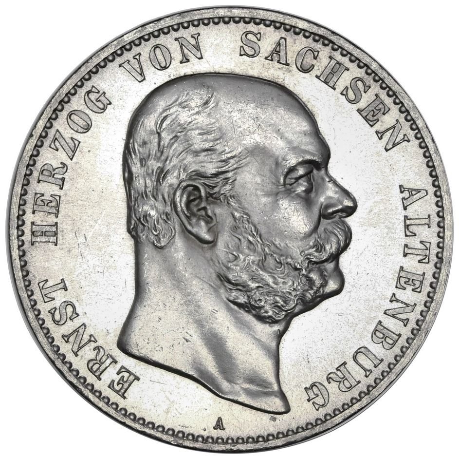 Saxe-Altenburg (German States), 5 mark, 1901-A, Ernst I, commemorating the duke's 75th birthday, rare, NGC MS 63. Jaeger-143; KM-38; Dav-815. A one-year type that was not saved in great numbers despite a modest 20,000 coin mintage, thus rarely encountered in Mint State without problems. Bright cartwheel luster shines across non-toned, original surfaces with a somewhat frosty quality to the bust, a few wispy contact marks on the obverse that are appropriate for the grade, tied with one other for second finest known in the NGC census. Pedigreed to the Zeitlos Collection (stated on label) and purchased from the Federal Coin Exchange auction of Nov. 13-14, 1954, lot #1313, with collector's envelope. NGC #5902795-023.
