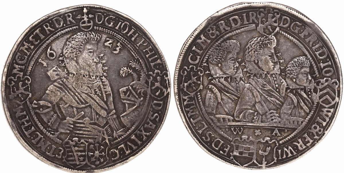 Saxe-Altenburg, German States, thaler, Johann Philipp I, Friedrich VIII, Johann Wilhelm IV and Friedrich Wilhelm II, 1623-WA, Saalfield mint. 28.66 grams. Attractively toned AXF, no problems.