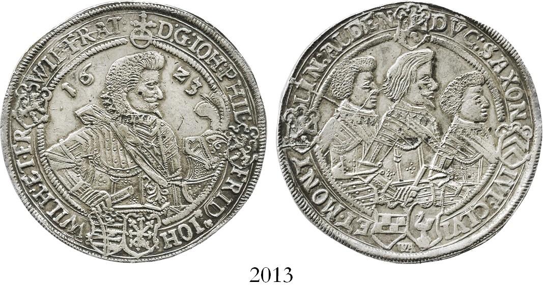 Saxe-Altenburg, Germany (Saalfield mint), thaler, Johann Philipp I and three brothers (Friedrich VIII, Johann Wilhelm IV and Friedrich Wilhelm), 1623-WA. KM-302. 29.1 grams. Huge and very intricately detailed coin, choice XF+ with contrasting toning.