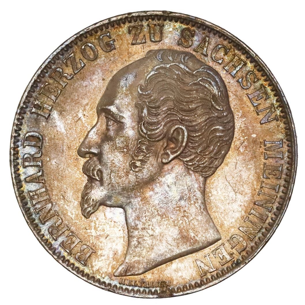 Saxe-Meiningen (German States), 2 taler, 1854, Bernhard, rare, NGC AU 58. Thun-377; Jaeger-446; KM-160; Dav-836. Crisp strike with light cabinet rub on the high points, deeply rainbow toned all over with subdued luster. Pedigreed to the Zeitlos Collection (stated on label) and purchased from the Ludwig Grabow fixed price list #7 of July 1957, lot #695, with collector's envelope. NGC #5902794-035.