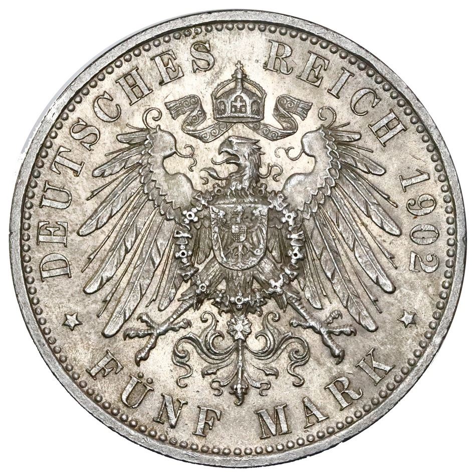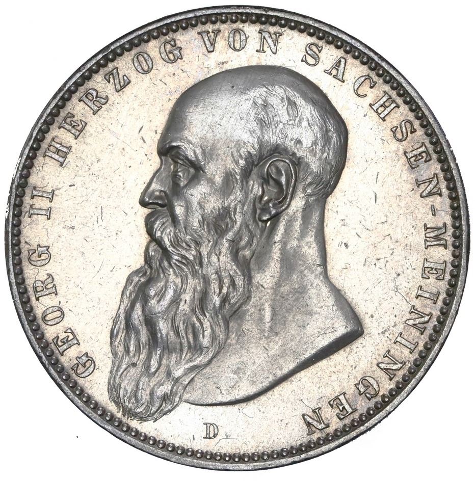 Saxe-Meiningen (German States), 5 mark, 1902-D, George II, long beard variety, NGC UNC details / obverse cleaned. KM-201; Dav-841. Bright white surfaces with mirror-like fields, faint surface hairlines on the obverse Pedigreed to the Zeitlos Collection (stated on label) and purchased from the Gerhard Hirsch auction #5 of March 29-31, 1955, lot #1442, with collector's envelope. NGC #5902794-033.