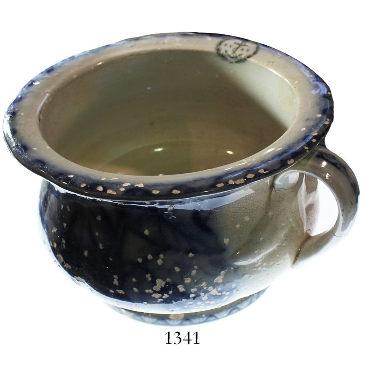 Scottish blue-and-white porcelain chamber pot, intact. 1435 grams, 5-1/2" tall and 8-1/2" in diameter. Beautifully intact and with vibrant blue floral pattern under shiny, slightly crazed glaze, anchor and F.V. & F. in wreath on rim, small simple handle on side, pockmarked here and there where barnacles were removed but otherwise choice and impressive for a wreck item, made by J. & M.P. Bell & Co. in Glasgow, Scotland (ca. 1842-1928), but unmarked. With original Christie's South Kensington certificate (lot #266) from 1997. Recovered from:General Abbatucci, sunk in 1869 off Corsica