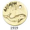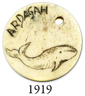 Scrimshawed whalebone disk inscribed with whale and "Ardagah," mid-1800s. 3.1 grams, 1-1/4" in diameter. Cute little artifact in excellent condition, circular with hole near edge, elegantly engraved, believed by the consignor to be a "kit bag ID tag."