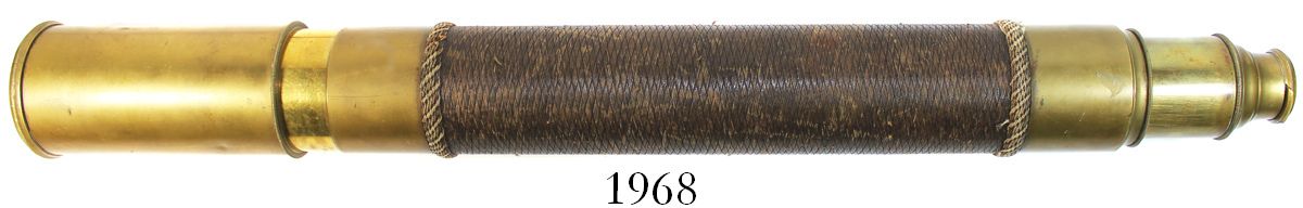 Sea captain's brass long glass (telescope or spyglass), ca. 1815-1840, British. 1341 grams; 10-1/2" long. Fully intact and functional, even with original lens covers at both ends, 38" long when fully extended, all brassy in color except for the wrapped-cloth center, which is very dark brown. With photo-certificate.