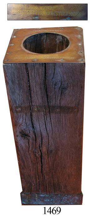Section of wood timber with plaque. 48 lb, 9" x 9" x 24". Visitors to Baltimore's Inner Harbor tourist area are familiar with the U.S. Navy frigate Constellation, the U.S. Navy's first ship put to sea and the first to defeat an opponent, now a popular tourist attraction. The ship was de-commissioned and scrapped in 1853, when a "new" Constellation was built from its remains, parts of which were later used to make souvenirs like this one to help fund renovations (probably in 1955, when she was de-commissioned again and placed in the Baltimore harbor as a museum ship). The brass plaque on top of this piece (perpendicular to the length of the beam), with large hole in center to contain a large ashtray, is engraved with ORIGINAL TIMBER / 1797 / U.S. FRIGATE CONSTELLATION, also with copper cap on bottom and 1½" x 4¼" rectangular hole through the middle for a crossbeam. Recovered from: Constellation, built in 1797.