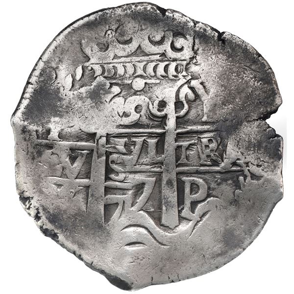 Potosi, Bolivia, cob 8 reales, 1671 E. S-P37b; KM-26; Cal-702. 26.45 grams. Three dates including bold full 1671 in legend (straddling an edge-crack),