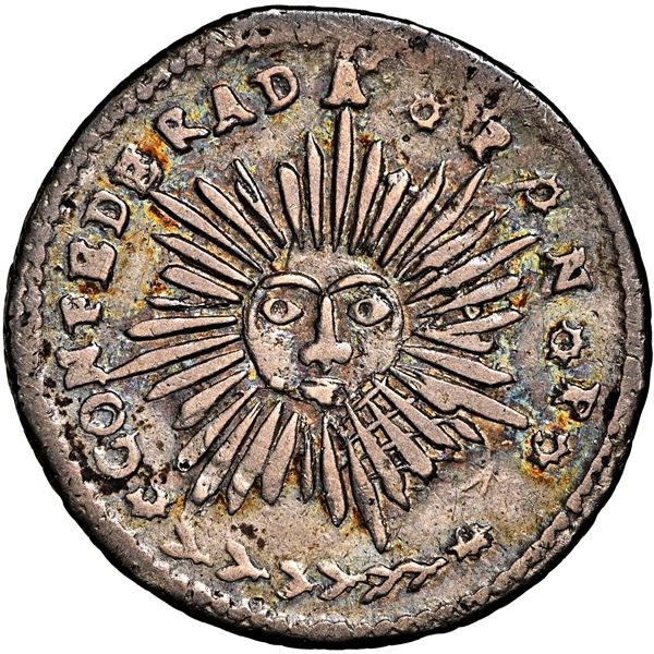 Cordoba, Argentina, 2 reales, 1844, CONFEDERADA, 4's leaning left, NGC VF 25, ex-O'Brien. Janson-49.4.24; KM-23. Crudely struck sunface sid...