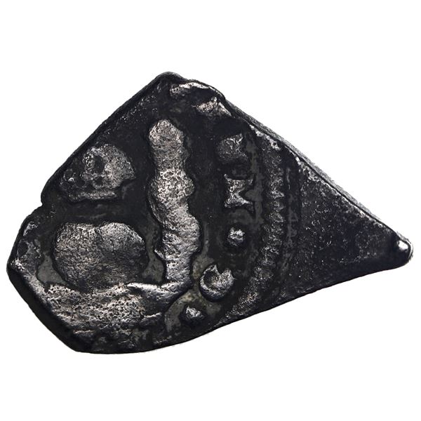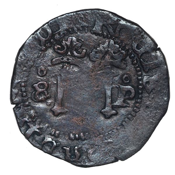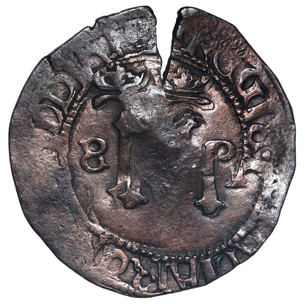 El Salvador, 1 real, arms countermark (Type V, 1868) on shield side of a Mexico City, Mexico, cob 1 real, Philip II, assayer not visible (O) to left,