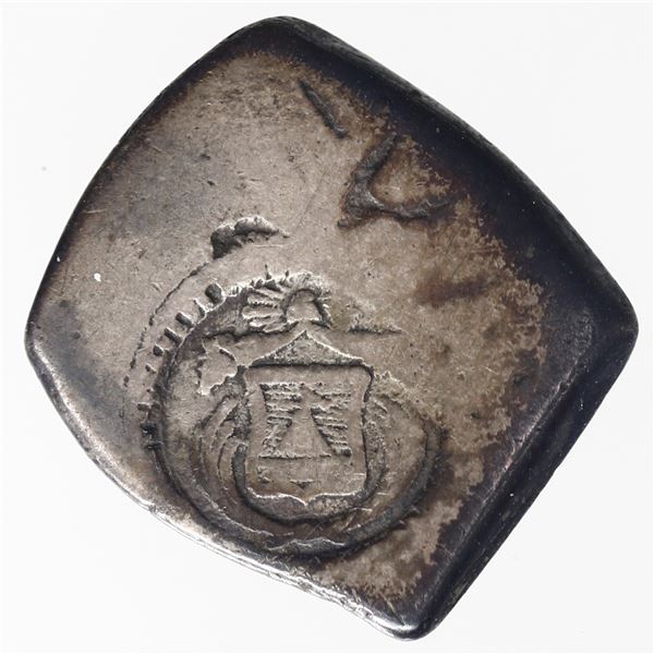 1708 - El Salvador, 1 real, arms countermark (Type V, 1869) on cross side of a Potosi, Bolivia, cob 1 real,Sedwick & Associates, LLC